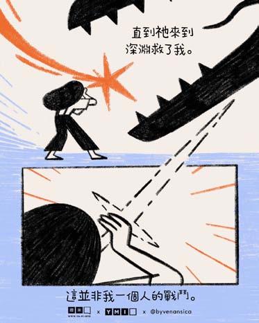 我知道媽媽很難過,不過有很多人 到醫院去看她,關心她。我和爸爸的 陪伴,還有大家的關心和安慰的話, 漸漸地,她的心靈康復了,她也能夠 接受這個事實,她開始變得樂觀。還 有就是她的腎臟也受影響,有洗腎的 可能,幸好在醫師治療了以後,腎臟 功能已經恢復。