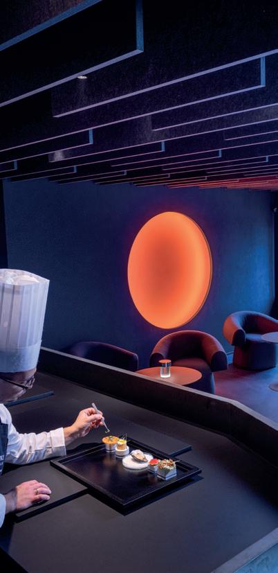 Una sfida lanciata da Michela e Emanuele Scarello, che, ci raccontano, sono “partiti da un’idea di ospitalità e accoglienza che separasse il luogo dell’aperitivo da quello della cena, quasi una soglia da varcare per lasciarsi alle spalle la quotidianità e per immergersi nei movimenti esperti degli chef, che anticipano anche visivamente i piatti”. Una sfida raccolta da Visual Display, studio progettuale pluripremiato che in soli 90 giorni ha interpretato l’esigenza dei clienti, creando un contenitore scenografico dalle funzionalità nascoste e dalla cromaticità omogenea, dove i riflessi e le luci puntate ad occhio di bue valorizzano di volta in volta il racconto delle materie prime, la preparazione di un cocktail, le prospettive geometriche dei piatti. Una sorta di quinta teatrale in armonia con il percorso di Michela e Emanuele tra parole e sapori, per rendere partecipi fin dall’inizio gli ospiti dell’esperienza enogastronomica unica che andranno a vivere. Signori, accomodatevi nel blu: il gusto entra in scena!