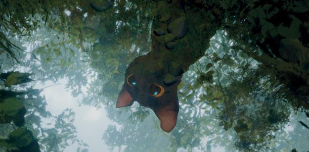 with a lot of detail using oil paint or watercolor, but the characters are flat shapes that are more stylized,” Zilbalodis observes. “If you make the characters too realistic, they can look cold and synthetic. You need to make the characters a little bit more graphic because they are more appealing that way.” All of the animals were chosen based on the theme of wanting to find a connection with others. Zilbalodis notes, “The lemur thinks he needs to have all of these shiny things so others will accept and love him. The cat learns to trust others and work together, but I wanted to have this counterpoint where the dog is almost too trusting and learns to be more independent.” The Secretary bird replaced the seagull from the original short film. Zilbalodis says, “We needed to have a more intimidating bird that can carry the cat. It’s big and strong. The Secretary bird also wants to be accepted by other birds. It is important that we can relate and understand each animal with all of their flaws. Each of them has their own character arc and learn something. The only exception is the capybara. It already knows what’s right from the beginning and is the mentor for the other animals.”