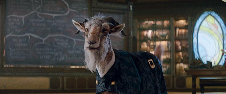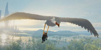 water out and added the simulated splashes on top of it,” Upītis states. “The thing is, we had to work with different scales of simulations. The close-ups had a dense simulation for the foreground, and the geometry in the background was sparser because you don’t need as much detail. Gints said that the simulations made in the previsualization looked better. In the end, the movie is quite stylized, so the splashes could be of a lesser quality.” The biggest challenge for the animation team was a long, continuous shot featuring several animators. “It was 6,606 frames, and eight animators worked together on different scenes, then we had to regroup all of the files into one,” Silly-Pélissier notes. “It was huge for the computer, and checking everything worked well. We started this shot at the beginning of the production and finished the shot near the end. This is the one when the cat looks at the fish, falls into the water, is drowning, the whale rescues him, and the bird takes him away and drops him.”