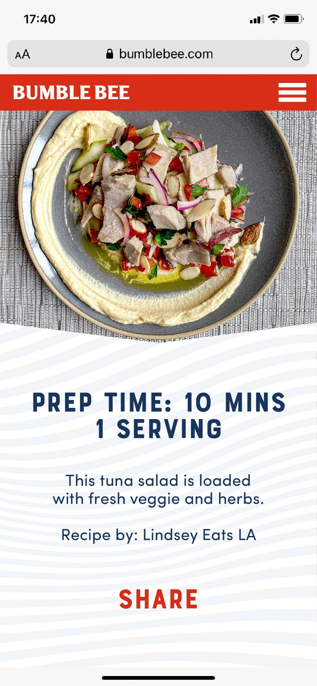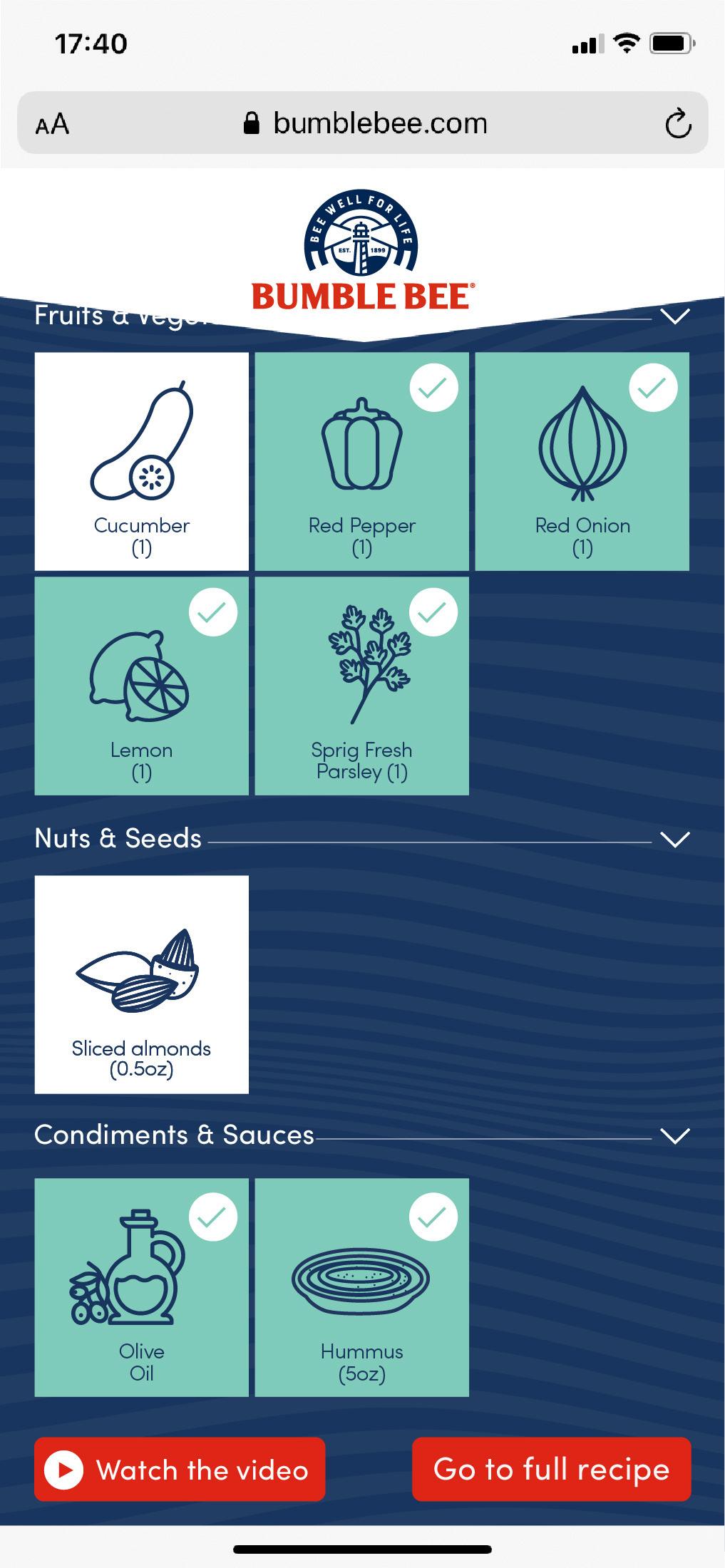 Producing a shoppable recipe program that connects the online and offline Bumble Bee brand experience through scannable POS. Bringing shoppers into the aisle and offering them an easy, delicious lunchtime recipe that they could shop for while in the store, then use our tools to make it at home.