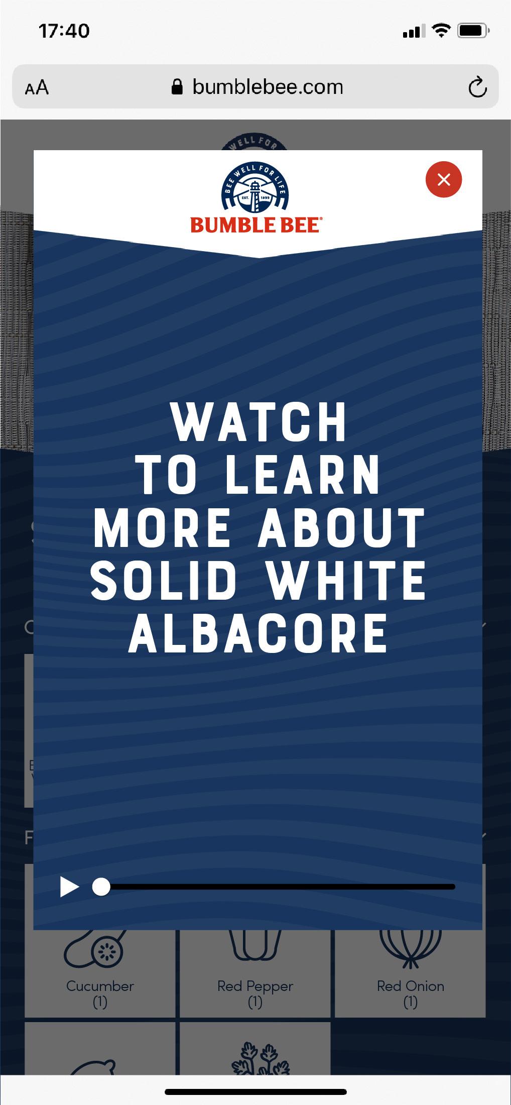 When tapping on Bumble Bee products, a pop-up opens with products video. By tapping the x the window will close.