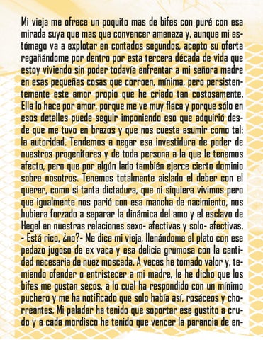 Mi vieja me ofrece un poquito mas de bifes con puré con esa mirada suya que mas que convencer amenaza y, aunque mi estómago va a explotar en contados segundos, acepto su oferta regañándome por dentro por esta tercera década de vida que estoy viviendo sin poder todavía enfrentar a mi señora madre en esas pequeñas cosas que corroen, mínima, pero persistentemente este amor propio que he criado tan costosamente. Ella lo hace por amor, porque me ve muy flaca y porque sólo en esos detalles puede seguir imponiendo eso que adquirió desde que me tuvo en brazos y que nos cuesta asumir como tal: la autoridad. Tendemos a negar esa investidura de poder de nuestros progenitores y de toda persona a la que le tenemos afecto, pero que por algún lado también ejerce cierto dominio sobre nosotros. Tenemos totalmente aislado el deber con el querer, como si tanta dictadura, que ni siquiera vivimos pero que igualmente nos parió con esa mancha de nacimiento, nos hubiera forzado a separar la dinámica del amo y el esclavo de Hegel en nuestras relaciones sexo- afectivas y solo- afectivas. - Está rico, ¿no?- Me dice mi vieja, llenándome el plato con ese pedazo jugoso de ex vaca y esa delicia grumosa con la cantidad necesaria de nuez moscada. A veces he tomado valor y, temiendo ofender o entristecer a mi madre, le he dicho que los bifes me gustan secos, a lo cual ha respondido con un mínimo puchero y me ha notificado que solo había así, rosáceos y chorreantes. Mi paladar ha tenido que soportar ese gustito a crudo y a cada mordisco he tenido que vencer la paranoia de en-