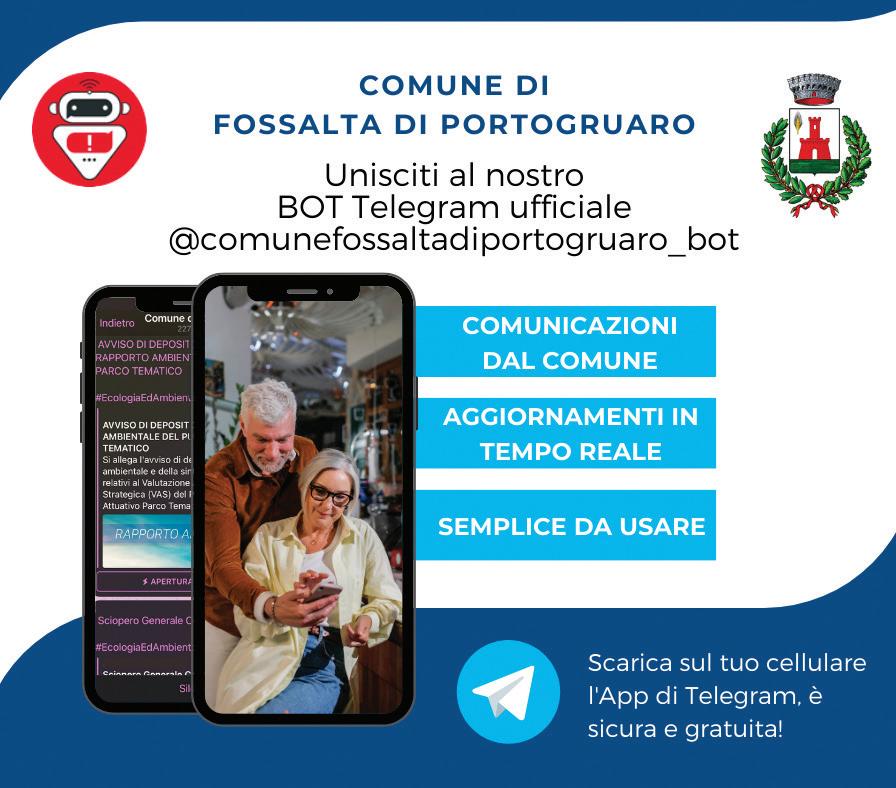 È sufficiente scaricare l’App gratuita di Telegram e digitare sulla barra di ricerca: comunefossaltadiportogruaro e cliccare AVVIA. Tutte le informazioni si trovano nel manuale, consultabile dal menù dei comandi (tasto a sinistra del campo del messag-gio).