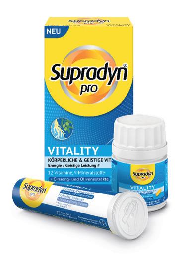 Viele Gehirnfunktionen & die körperliche Mobilität lassen mit fortschreitendem Alter nach, die Zellalterung beschleunigt sich. Supradyn® pro VITALITY wurde speziell dafür entwickelt, die körperliche & geistige Vitalität zu unterstützen. Supradyn® pro VITALITY ist ein umfassendes Präparat mit 12 Vitaminen, 9 Mineralstoffen & hochwertigen Ginseng und Olivenextrakten.
