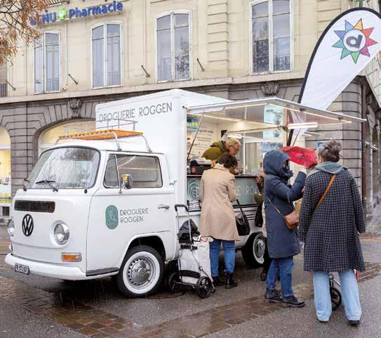 für den Start investiert. Motor, Bremsen – alles am VW-Bus wurde neu gemacht. Jetzt bräuchte es nochmals eine Investition von 20 000 bis 30 000 Franken für eine Kühlanlage. «Eigentlich hiess es, es sei ganz einfach. Stellt sich heraus, dass ‹ganz einfach› bedeutet, dass wir alles nach Mass anfertigen lassen müssten.» Darum werde er nun auf den Sommer hin einen neuen Bus kaufen. Den alten behält er noch ein Weilchen für Marketingzwecke, «bevor er später vielleicht bei einem anderen Drogisten in einem anderen Kanton ein zweites Leben findet», sagt Roggen. Der Oldtimer sei zwar sehr hübsch, aber auch nicht sehr praktisch. Um in den Bus zu gelangen, muss man sich bei einer Schwelle kurz ducken, es ist eng und die Haltung, in der man die Kundschaft berät, ist nicht sehr angenehm. Hinzu kommt, dass man die Produkte, die man hervornimmt, direkt wieder an denselben Ort versorgen muss. Jeder Zentimeter wird genutzt. «C’est un peu de bricolage», sagt er lachend.
