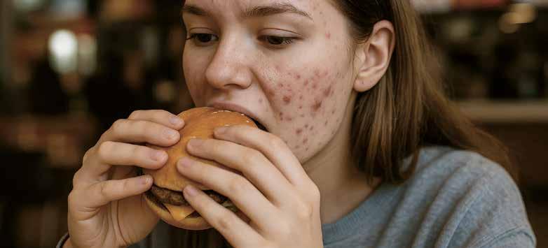 Leucin, eine Aminosäure in der Nahrung, aktiviert sowie indirekt auch durch IGF-1.² Spannend ist, dass sowohl Leucin, der Insulinspiegel im Blut wie auch IGF-1 durch unsere Ernährungsweise mitbeeinflusst werden können. Unsere Ernährung kann also Akne verschlimmern, da sie die Spiegel an Insulin und IGF-1 im Blut erhöhen kann. Dies ist insbesondere bei der westlichen Ernährungsweise der Fall, bei der dem Körper viel Zucker, stark verarbeitete Lebensmittel, gesättigte Fette und Milchprodukte zugeführt werden.¹ Insgesamt belegen verschiedene Untersuchungen die Rolle der Ernährung bei Akne als begleitende Therapie (siehe Zusatztext «Was hilft bei Akne?» auf Seite 25), deshalb sollte die Ernährung bei der Behandlung nicht ausser Acht gelassen werden.1,4 Die folgenden Abschnitte zeigen, wie sich Kohlenhydrate, Milchprodukte und Fette auf Akne auswirken können.