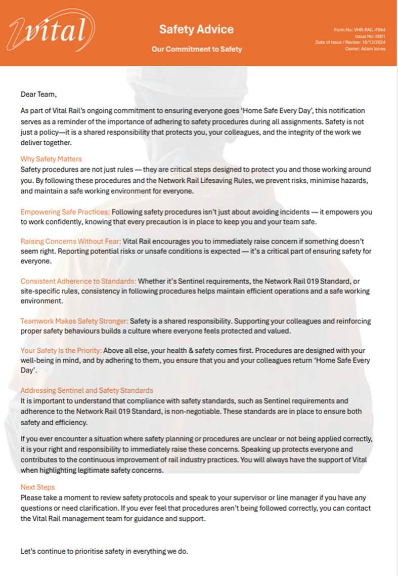 As we step into 2025, I want to take a moment to reflect on our safety journey and set our focus for the year ahead. At Vital Rail, safety is at the heart of everything we do, and this year, we are doubling down on our commitment to ensuring that every member of our team goes home safe, every single day.