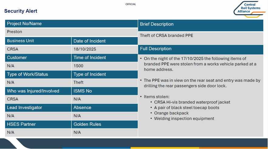 Please be vigilant in keeping all PPE secure and out of sight when not in use To reduce the risk of theft, ensure PPE and work equipment are stored in the boot of cars or the rear of vans where visibility is significantly reduced.Avoid leaving items visible through windows at any time.Your cooperation helps protect valuable equipment and prevents unnecessary loss or delays to work.