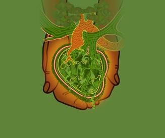 Dosmanosmarronessostienenuncorazónverde brillanteconfollajequecreceasualrededor.Un árbolcreceenlapartesuperiordelcorazón,con raícesanaranjadasquetienenlaformadeltubo delcorazón..