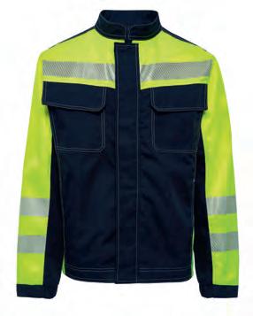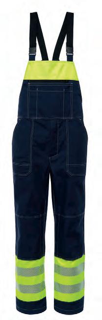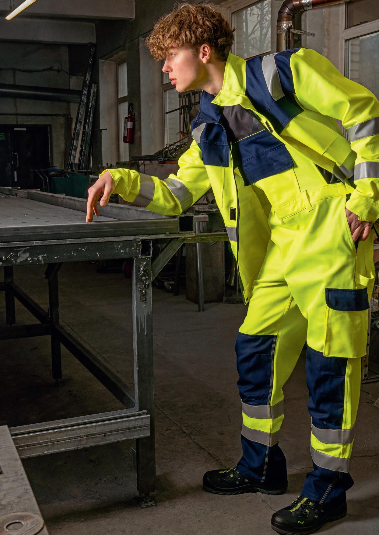 Gero matomumo darbo drabužiai su geltonos neoninės medžiagos detalėmis. 5 cm pločio atšvaitinės juostos, užklijuotos ant neoninės geltonos spalvos detalių, užtikrina saugumą tamsiu paros metu.