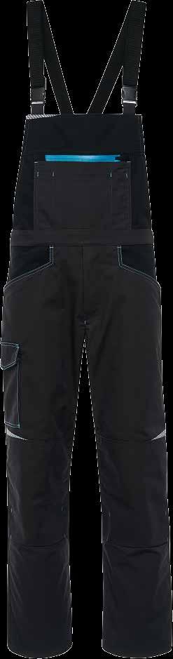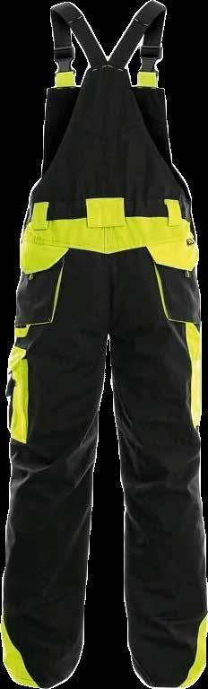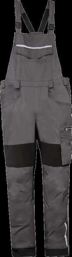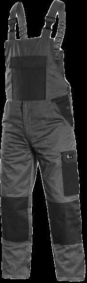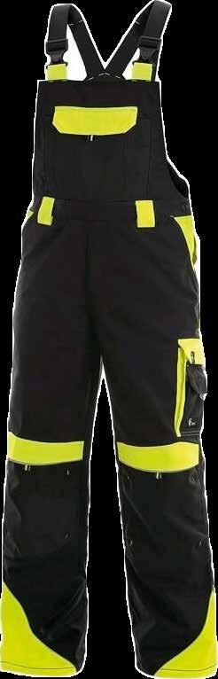 CANVAS pynimo, labai tvirto audinio. Dvi multi funkcinės kišenės kelnių šonuose, dvi šoninės, dvi galinės kišenės. Didelė multifunkcinė išorinė kišenė krūtinės srityje, vidinė kišenė užsegama užtrauktuku. Sustiprinti keliai, su angomis antkeliams. Kilpos diržui. Atitinka EN ISO 13688 standartą.