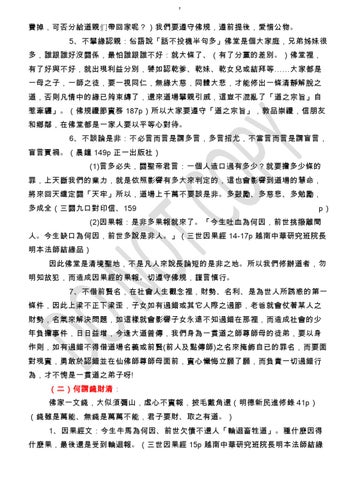 (2)因果報:是非多果報就來了。「今生吐血為何因,前世挑撥離間 人。今生缺口為何因,前世多說是非人。」(三世因果經 14-17p 越南中華研究班院長 明本法師結緣品) 因此佛堂是清境聖地,不是凡人來說長論短的是非之地。所以我們修辦道者,勿 明知故犯,而造成因果經的果報。切遵守佛規,謹言慎行。 7、不借前賢名,在社會人生觀念裡,財勢、名利、是為世人所誘惑的第一 條件,因此上梁不正下梁歪,子女如有過錯或其它人際之過節,老爸就會仗著某人之 財勢,名氣來解決問題,如這樣就會影響子女永遠不知過錯在那裡,而造成社會的少 年負擔事件,日日益增,今逢大道普傳,我們身為一貫道之師尊師母的徒弟,要以身 作則,如有過錯不得借道場名義或前賢(前人及點傳師)之名來掩飾自已的罪名,而要面 對現實,勇敢於認錯並在仙佛師尊師母面前,實心懺悔立願了願,而負責一切過錯行 為,才不愧是一貫道之弟子呀! (二)何謂錢財清: 佛家一文錢,大似須彌山,虛心不實報,披毛戴角還(明德新民進修錄 41p) (錢雖是萬能、無錢是萬萬不能,君子要財、取之有道。) 1、因果經文:今生牛馬為何因、前世欠債不還人「輪迴畜牲道」。種什麼因得 什麼果,最後還是受到輪迴報。(三世因果經 15p 越南中華研究班院長明本法師結緣