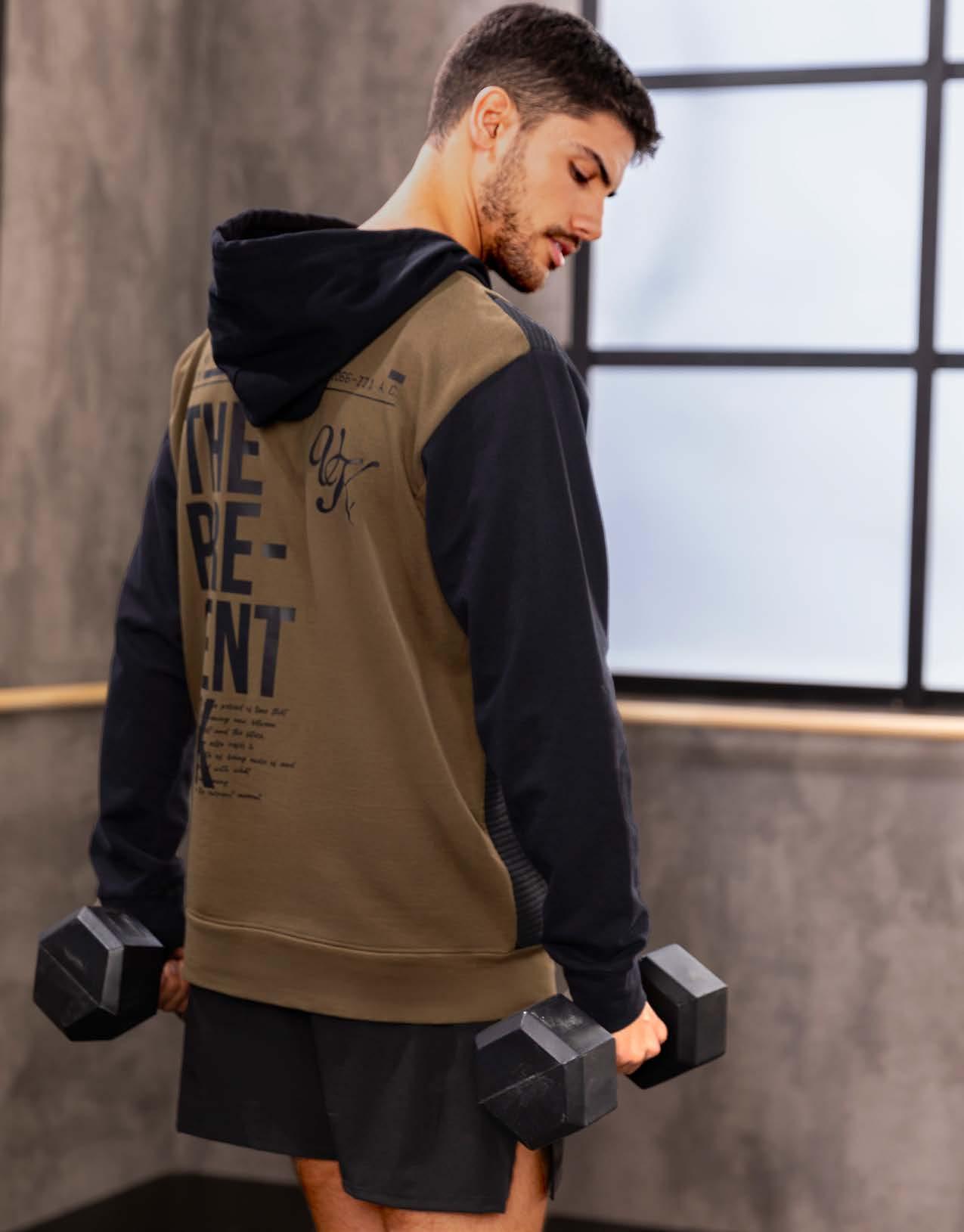 Buzo cuello a la base algodón rústico con recortes redondeados a contratono y estampa 3D en delantero. Cuenta con bolsillo canguro 05-6555-02 S/M/L/XL NOVEDAD $84.999