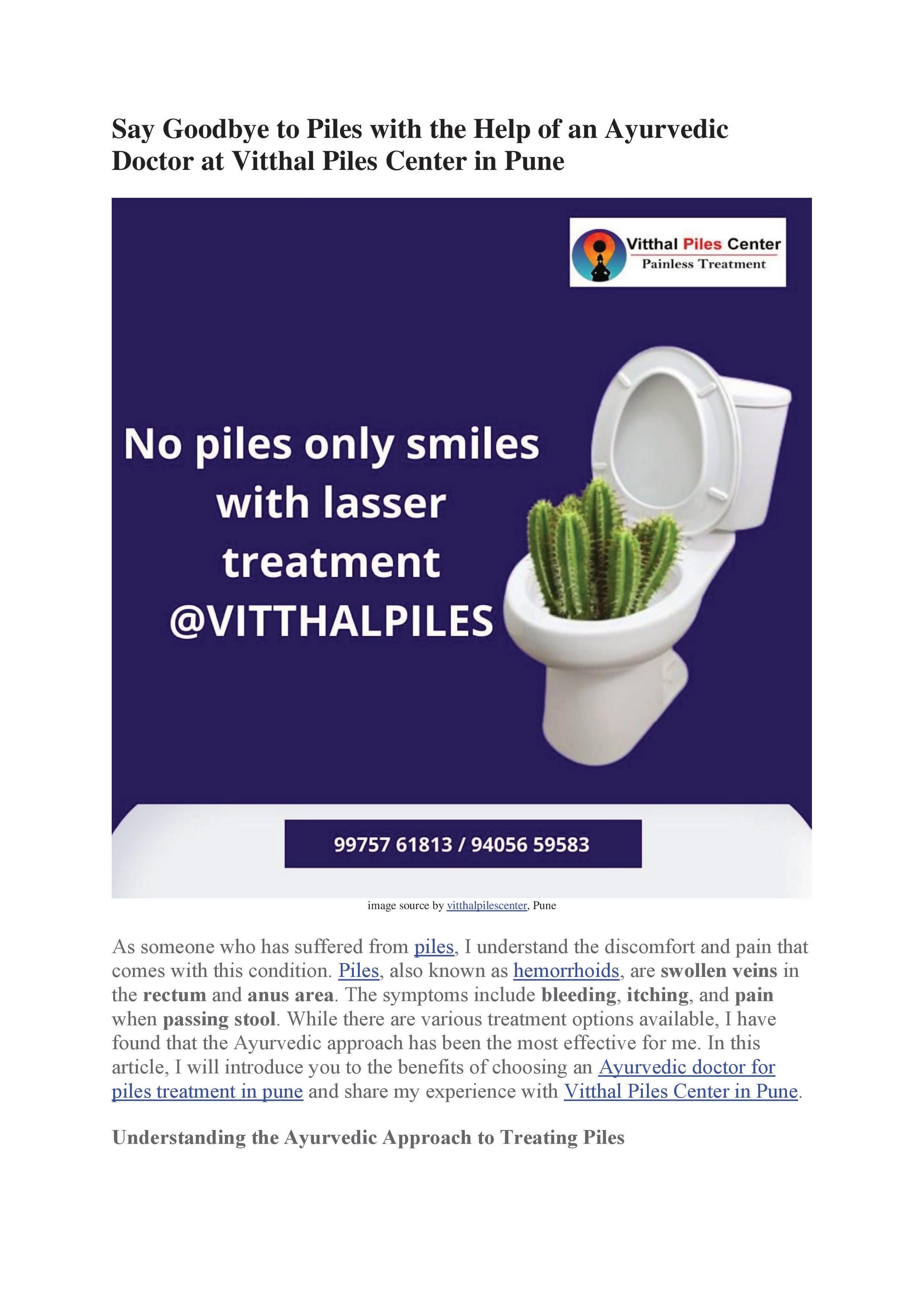 Piles can be a painful and uncomfortable condition, but it is important to remember that there are effective treatment options available. Ayurvedic treatment is a natural and holistic approach to treating piles that focuses on treating the root cause of the problem. If you are looking for an Ayurvedic doctor for piles in Pune, Vitthal Piles Center is an excellent choice. The center is run by a team of experienced and compassionate doctors who are dedicated to providing the best possible care to their patients.