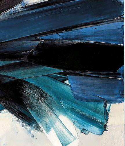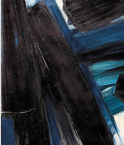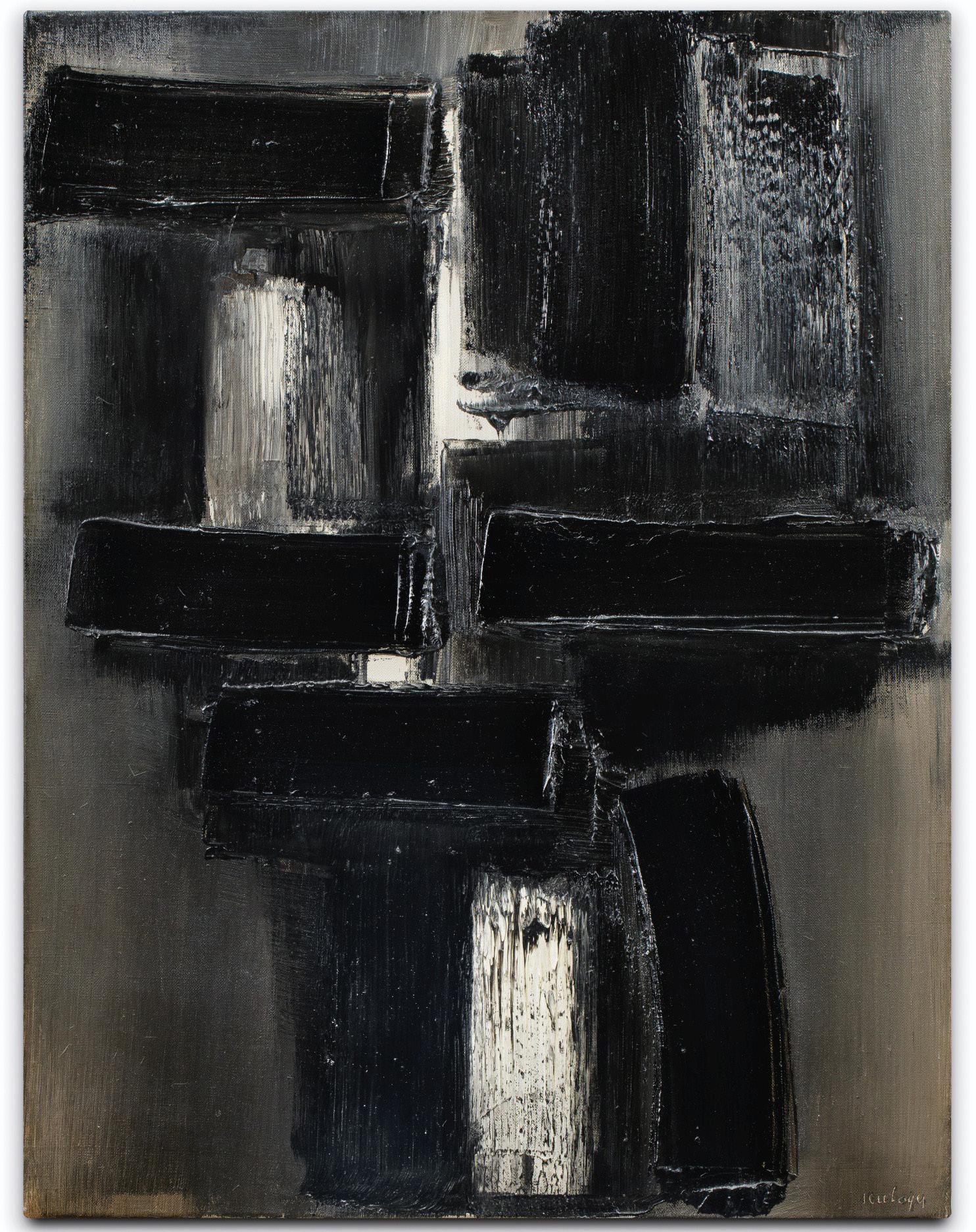 Après une série de pay sages austères et drama tiques, vers cette même année, les premiers si gnes d’un langage ab strait, basé sur des lignes de force, apparaissent dans les œuvres de S.. Dans sa recherche sévère et constante d’un langa ge essentiel, sa peintu re reçoit une empreinte dramatique vigoureuse de la disposition structu rellement organisée de marques sombres violen tes sur des fonds gris ou clairs, parfois animés par une touche stridente de rouge, de bleu ou de vert. Associé depuis la fin des années 1940 à l’art abstrait, il est particu lièrement connu pour son usage des reflets de la couleur noire, qu’il ap pelle « noir-lumière » ou « outrenoir ».