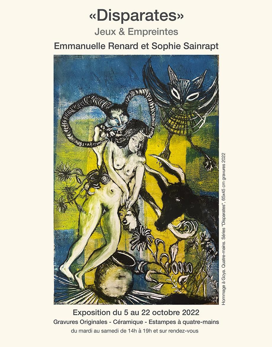 Jeux & Empreintes est le dialogue entre les œuvres gravées et les céramiques de deux artistes, Emmanuel le Renardet Sophie Sainrapt, passionnées par Goya et ayant toutes deux conscience que l’art est une affaire d’alchimie entrel’inconscient, le corps et la matière. Dessiner, graver, encrer, imprimer, gratter, peindre… De leurs gestes naissent des personnages et des créat ures insolites, dans des mises en scène poétiques et atypiques.