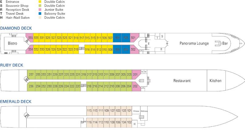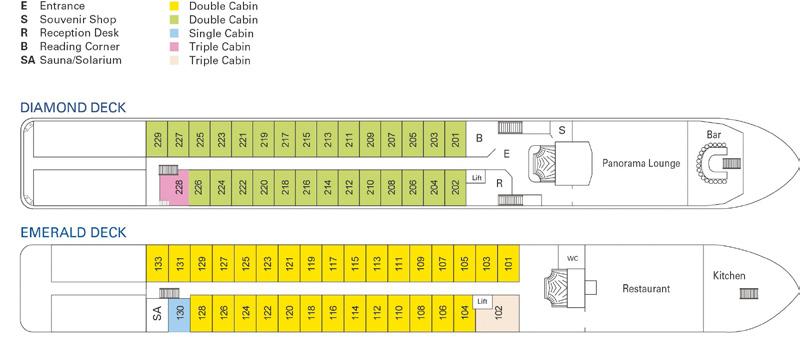 Smaragd-dek. Toeslag eenpersoonskajuit: 20% (januari, februari, maart, november), 30% (april, oktober, december), 45% (mei-september), suites 100% – beperkt contingent. Korting voor kinderen: