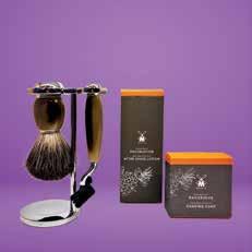 Für Gentlemen der alten Schule: Mühle Rasierset in HornoptikKunstharz (99 €). Rasierseife & Rasurlotion mit pfl anzlichen Inhaltsstoff en (6,50 € & 23,95 €).