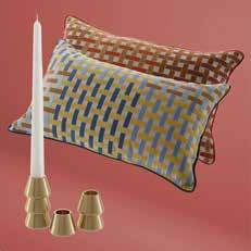 1 Ligne Roset Für gemütliche Sofastunden: Die Kerzenhalter „Asata“ aus verchromtem Messing lassen sich stapeln oder hübsch anordnen (Set mit 5 Kegeln 88 €). Die Kissen „Cruciverba“ in Safrangelb und Blau erinnern an Kreuzworträtsel (30 x 50 cm, je 88 €).