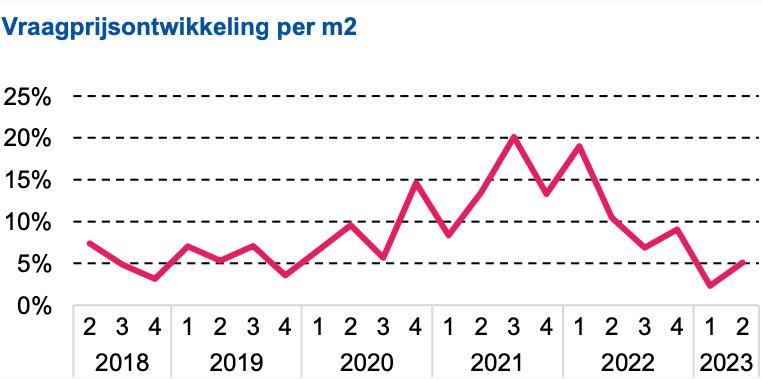 De gemiddelde vraagprijs kwam in het tweede kwartaal van 2023 uit op gemiddeld € 514.000, een stijging van 5 procent ten opzichte van vorig jaar. Kijken we naar de vierkantemeterprijs, dan is de stijging vergelijkbaar (5,1%). Op kwartaalbasis steeg de prijs per m2 met 4,1 procent.
