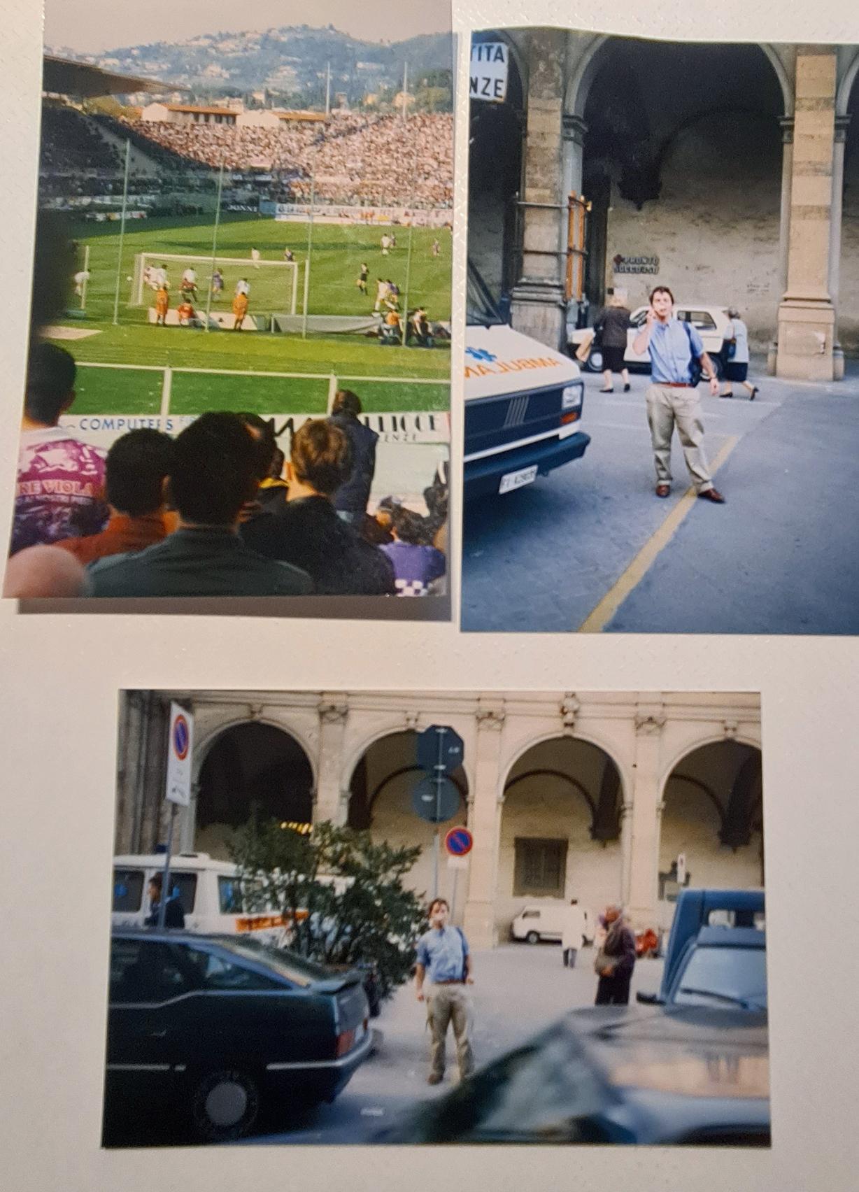 Het bezoek van V.I.V.A. aan Florence in april 1993. Bezoek aan Fiorentina -Napoli en na het bezoek aan het ziekenhuis met gaas op mijn bovenlip nadat deze was gaan bloeden.