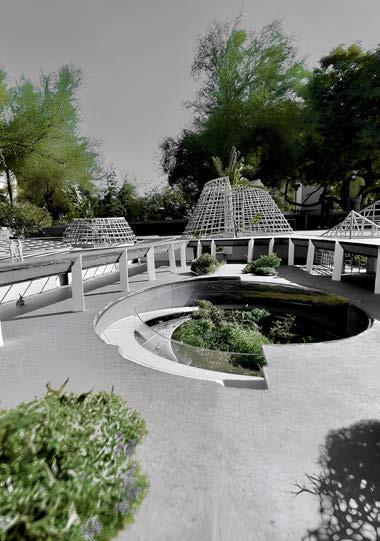 The expansion designed for the Lucile Halsell Conservatory consists of four new pieces that continue the pattern of fragmented buildings on site. To maintain balance, the underground pond expansion and new courtyard are placed along the main project axis, and two new circular structures have been added to either side of the fern grotto. The geometry of the roofs also resembles the existing conical shapes.