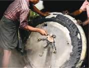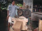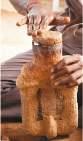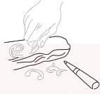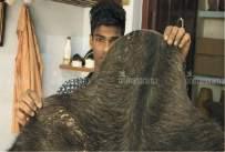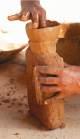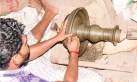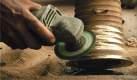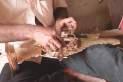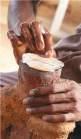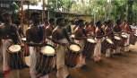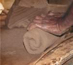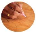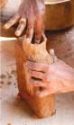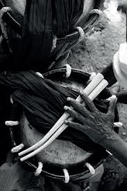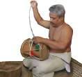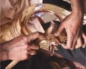 An even more difficult task demanding precision is creating the black circular ring that you spot on the centre of the mridangam sides and the tabla. The process of making them is called 'mashiyidal'.The black powder is obtained from a stone called puranakallu, rich in iron. These stones are mostly taken from temple ponds. The powder is then mixed with boiled rice, kneaded well to a paste and is smeared on the mridangam head the sides of the mridangam. The strings are pulled and fastened tightly to set tension at all spots to create the perfect shruthi or the tone at all points