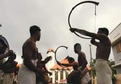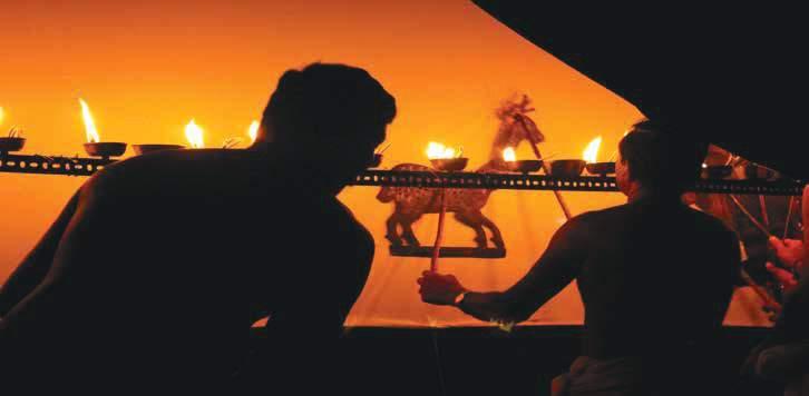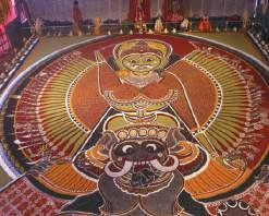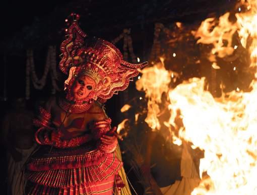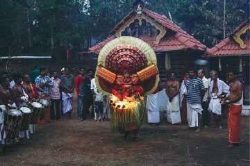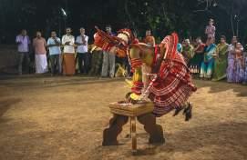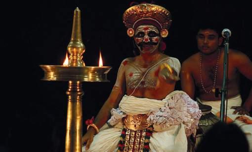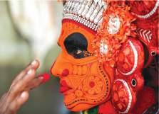 In ancient times people believed that performing various pujas in village temples and other public places would solve all their problems. The 'lower' castes also took advantage of the special status accorded to them by the rituals. With elaborate designs on the face, glamorous ornaments and huge hats, the artists tried to convince everyone, including the upper caste Brahmins, to accept their divinity.
