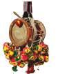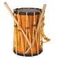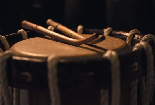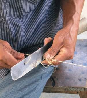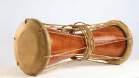 The base drum is made using jackfruit wood or Kanikonna. The dried skin is the cut to length and attached to the ends of the drum, sealed and knotted to perfection using hands. The drums are balanced between the legs, and the outerstraps made of buffalo skin are inserted through small slits round the sides of the mridangam. The strings are pulled and fastened tightly to set tension at all spots to create the perfect shruthi or the tone at all points.