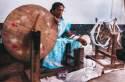 Yarns are wound to the pirns by the charaka equipment for the weaving process.