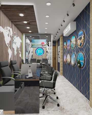 Project Description: The proposal consisted the interior design of a Tours & Travels of昀椀ce consisting of Welcome entrance, Common of昀椀ce and Seating area, Executive cabin, pantry area and Toilet.