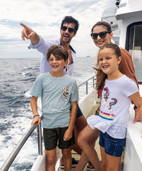 Desde el hotel, la aventura con‑ tinúa mar adentro a bordo del yate Sea Lion. Cada excursión es una oportunidad para explorar islas cercanas de forma segura, acompañados por guías naturalistas expertos que saben cómo captar la atención de los más pequeños y despertar la curiosidad de los grandes. Caminar junto a fragatas o piqueros de patas azules, ver pingüinos nadar a tu lado o descubrir peces de colores mientras se practica “snorkeling”, son experiencias que toda la familia recordará por siempre.