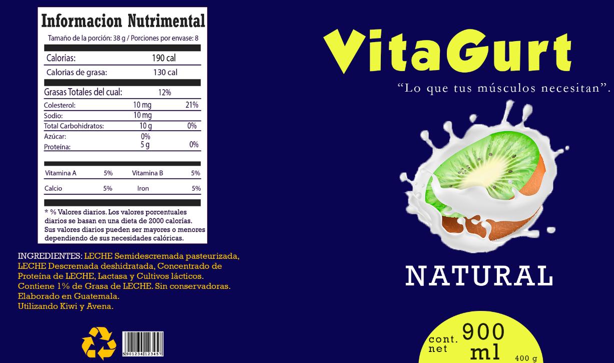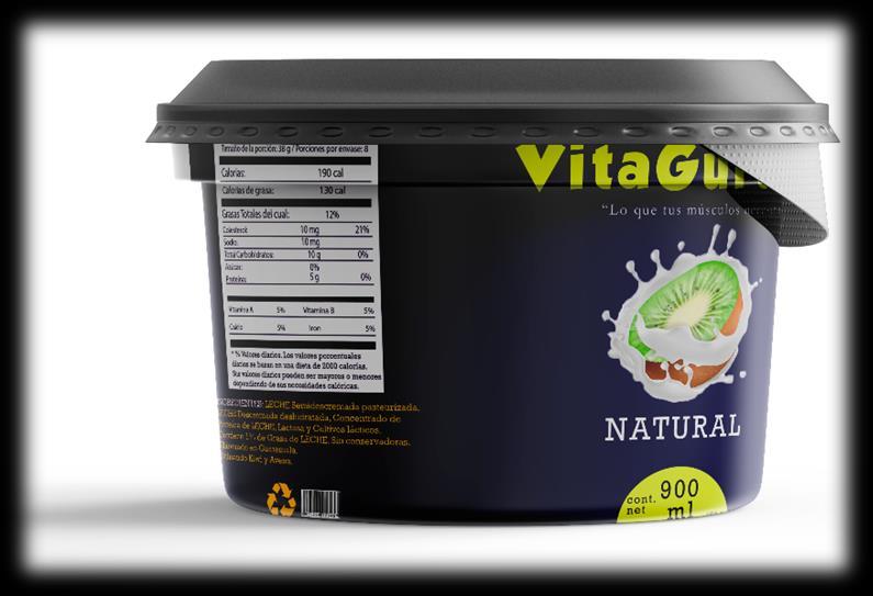 Naming: El desarrollo sobre el nombre de nuestro producto que va a depender alrededor en el que se venderá. Ideas de nombres: • Yoguvit • Gutapro • VitaLife • VitaGurt IDEA FINAL: EXPLICACION: se eligió al final el nombre de “VitaGurt”porque es una forma muy sencilla de pronunciar y de entender ya que viene siendo de “Vita” de Vitamina y “Gurt” de Yogurt. Hace que las personas al leer puedan imaginar un alimento como el yogurt, que contenga vitaminas y no sea tan pesado. Esta acompañado con un Slogan el cual dice “Lo que tus músculos necesitan” apoyando un texto corto para captar el mensaje del producto.