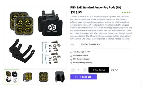 03 VIVIDL FNG 3 STREET LEGAL & OFFROAD 3" LIGHT PODS HIGH- INTENSITY OSRAM CHIPS ADVANCED TIR PROJECTOR OPTICS SAE COMPLIANT MULTIPLE BEAM PATTERNS AND OPTIONS The FNG 3 is the latest in 3” pod technology. It's packed with 4 5w high output Osram chips that will exceed your expectations. The different reflectors gives you multiple beam pattern options, from SAE street legal compliance to intense off-road capability.