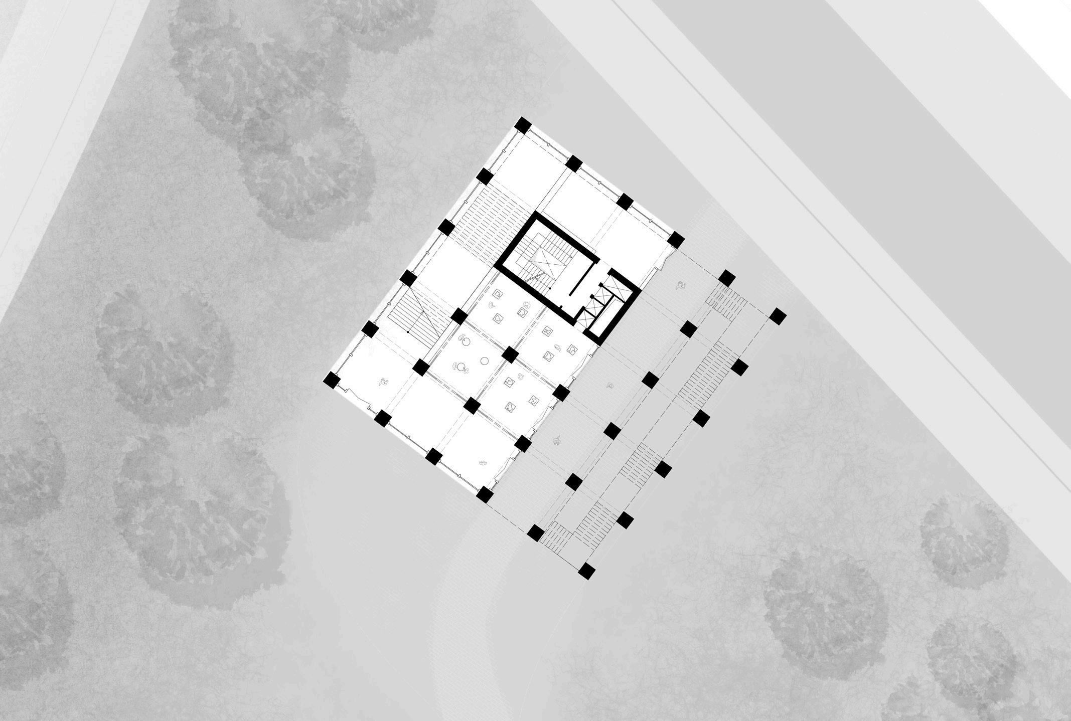 Our concept is based on drawing a pattern like a carpet over the existing plot The carpet is made up of four modules placed next to each other to form the main building This creates a private inner courtyard in the middle