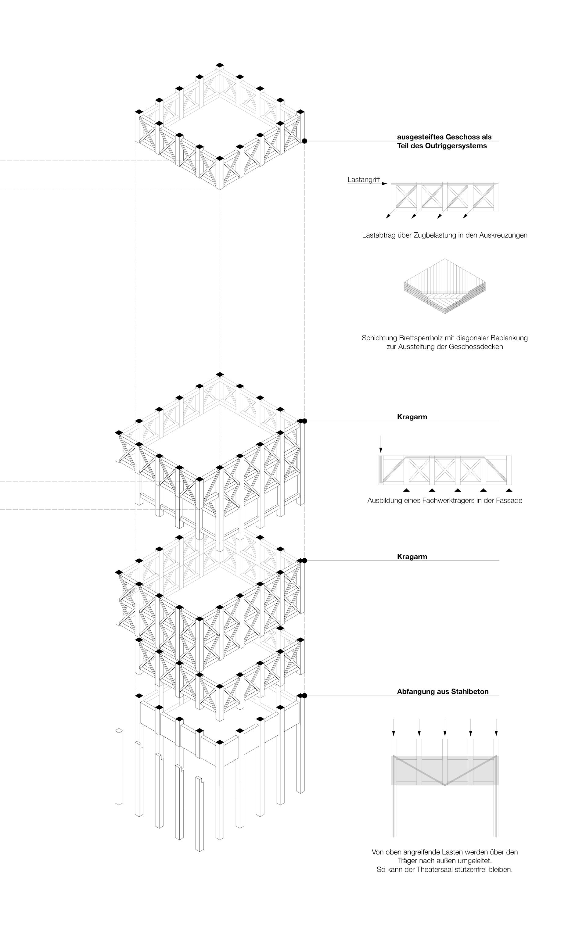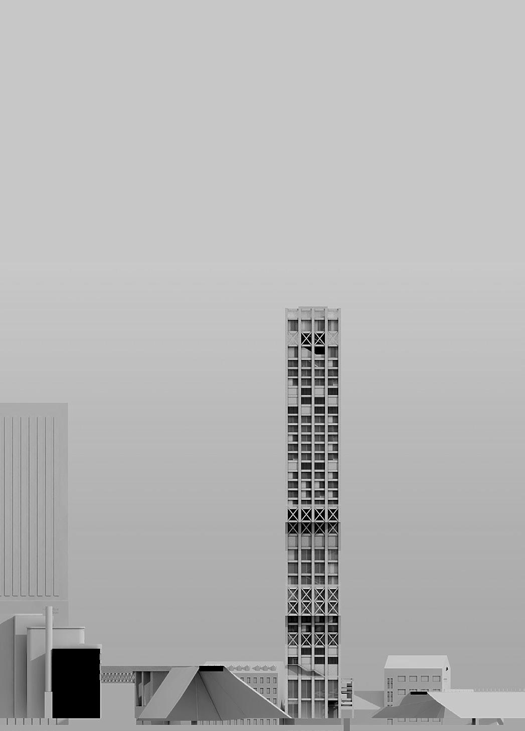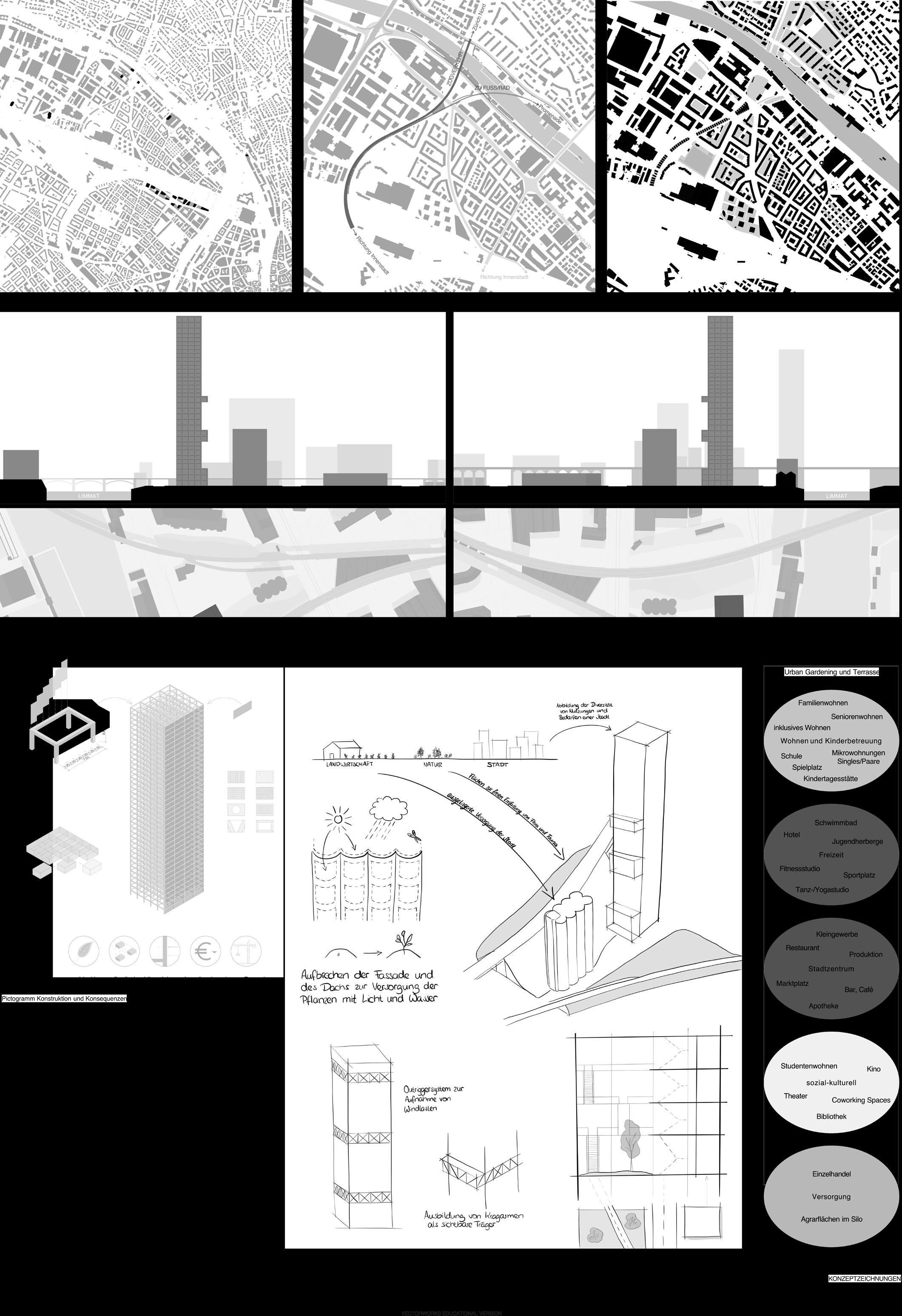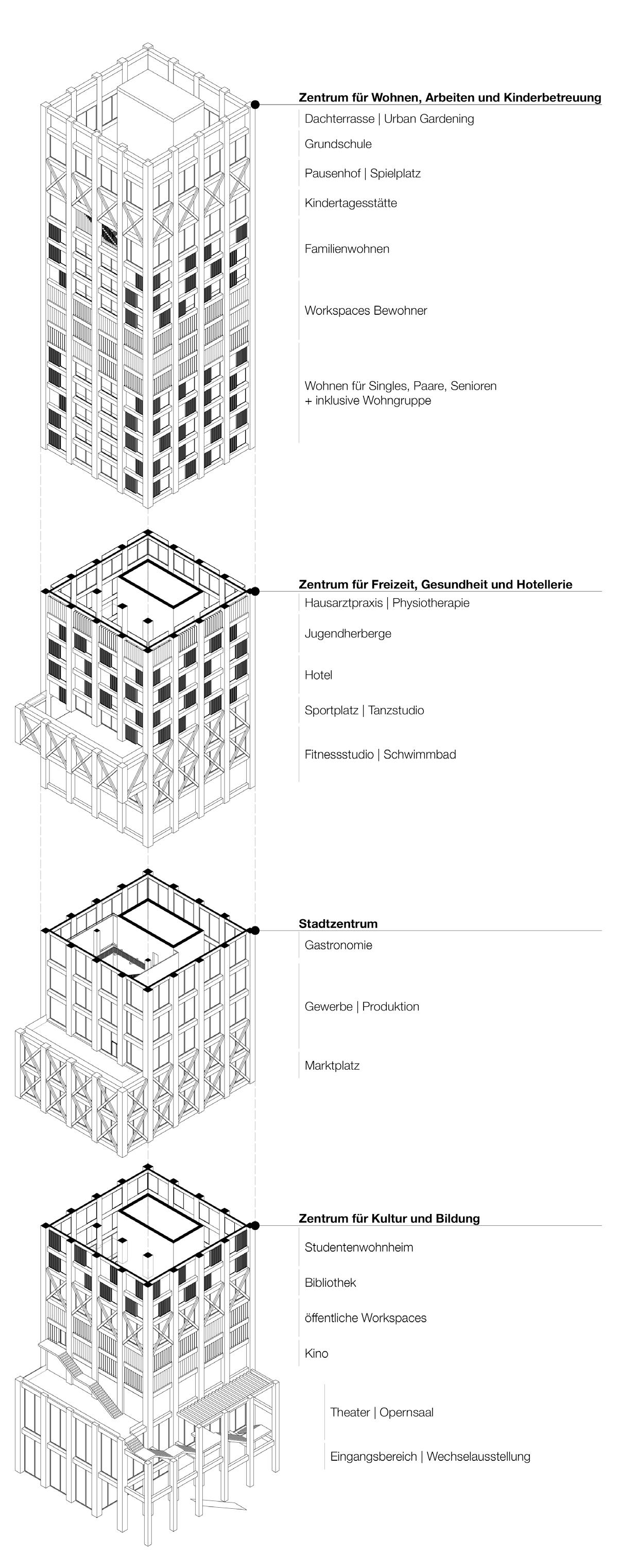 The example of this core center shows that we have found a solution for the individual problem of the area East and west no longer coexist a connection has now been created as you can reach the east through the library It extends upwards and is open to the public The observation tower which is located next to the library connects distant points with each other cristo for example is visible from here The residential area is somewhat loosened up so that there is a semi-public center in the middle Above all, the green park ensures that downstairs and upstairs are connected and community areas are created