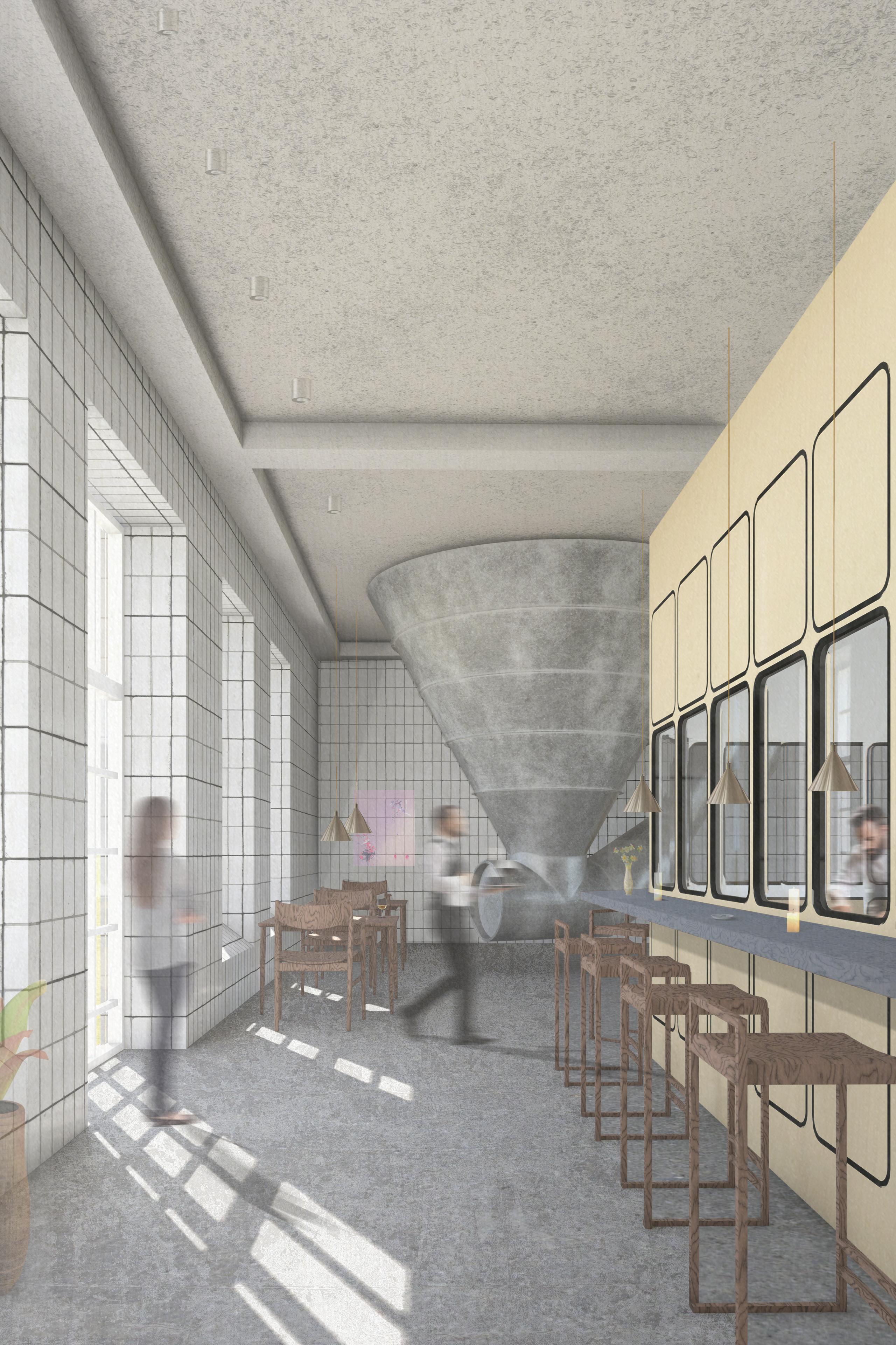 Our architectural design for Rio Seco in Lisbon represents an innovative vision that aims to revitalize and transform the area into a vibrant sustainable community hub. Our central element is a multifunctional facility consisting of a modern library and café that serves as a cultural meeting place and social hub.