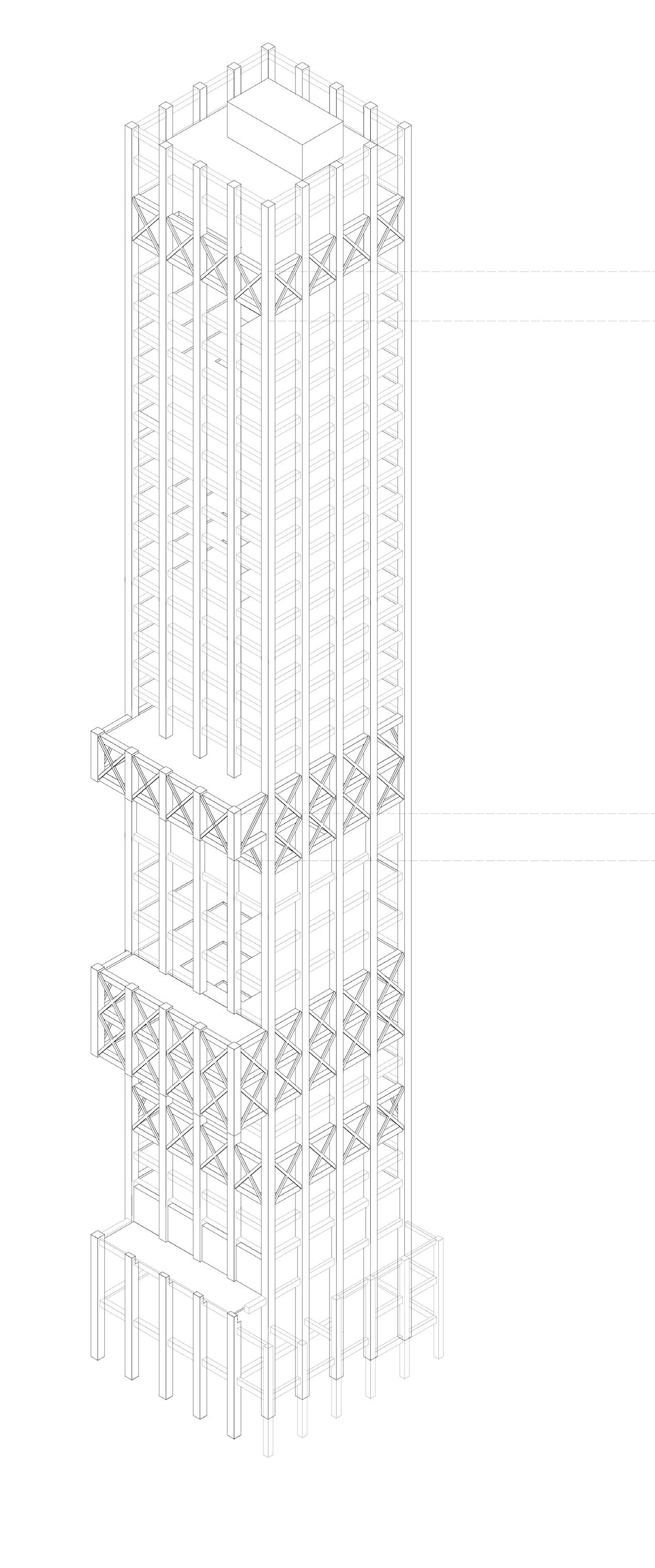 The individual modules consist of a living space that is divided into different floors, with full and half floors that create an air space