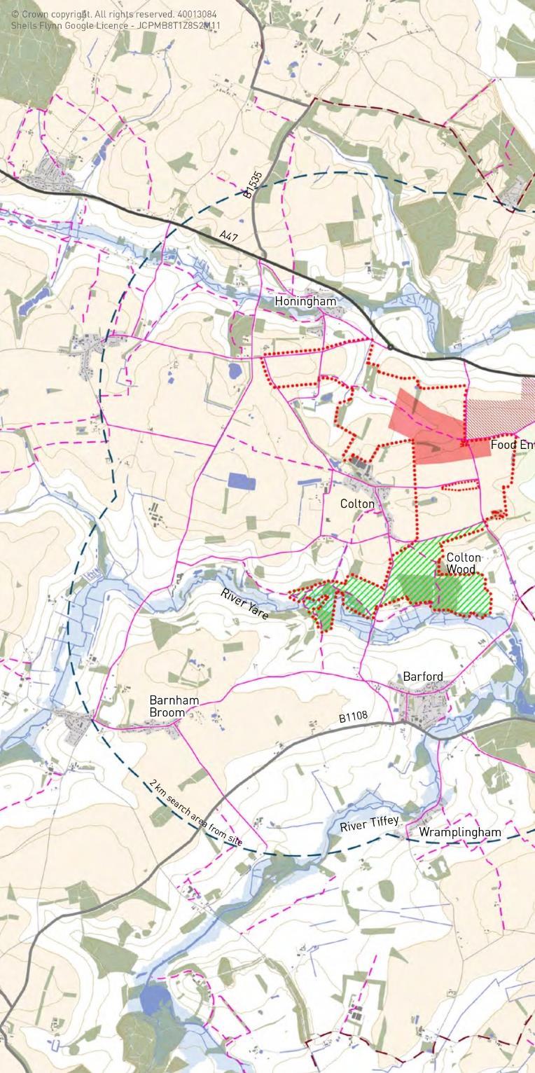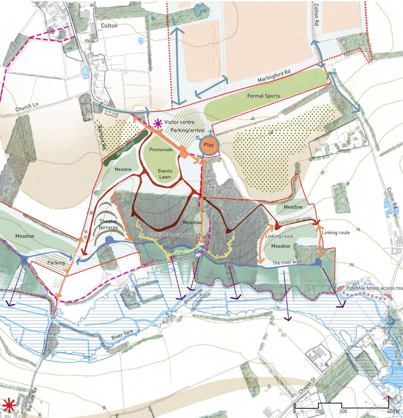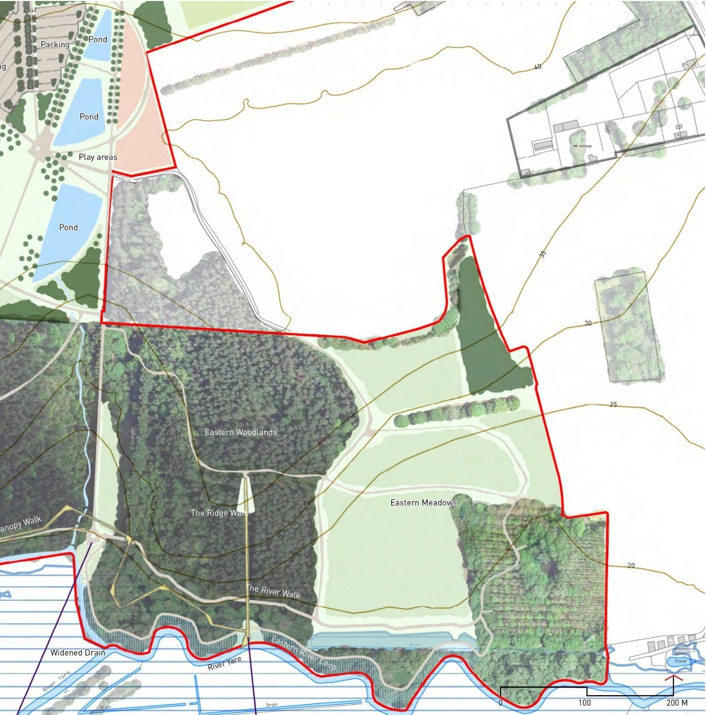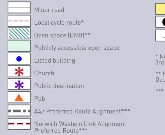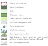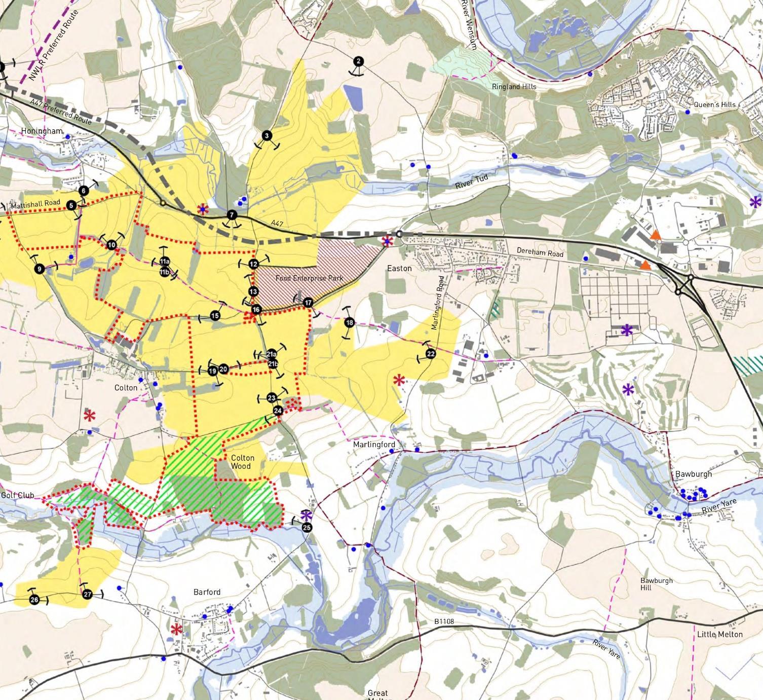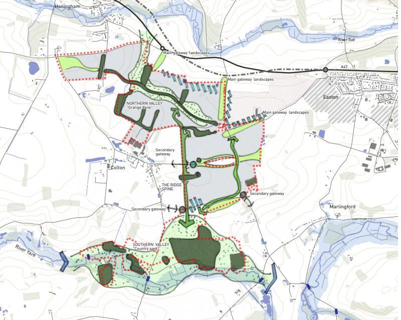 An ambitious proposal for a new community at Honingham Thorpe potentially to be leading as an exemplar for sustainable development. The site incorporates 81 ha of country park and 5 ha of nature reserves. The emerging plans include approximately 4,600 houses and 72 ha of employment space with new transport links, schools, community facilities and healthcare. The site is located in the ridge that separates the River Yare to the south from River Wensum. At the northern of the site, a piece of land is allocated for Food Enterprise Park which will support food production, processing, and agriculture trough the co-location of commercial enterprises. The southern part of the site developed as a country park above The River Yare.