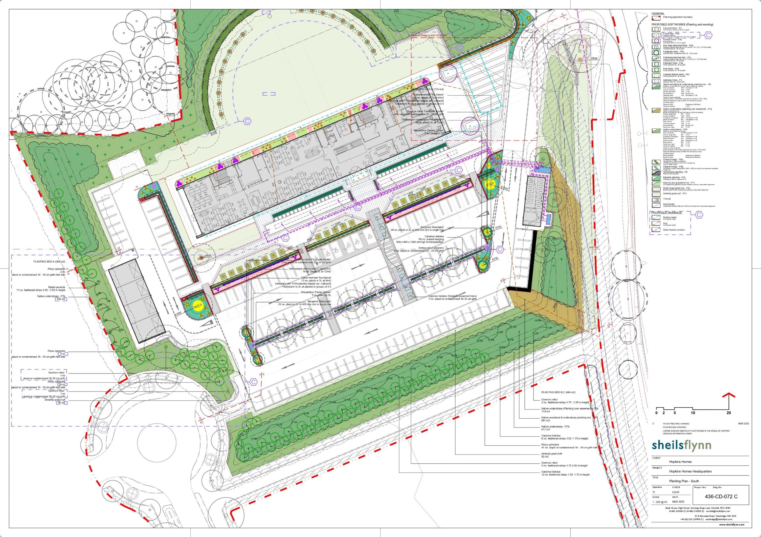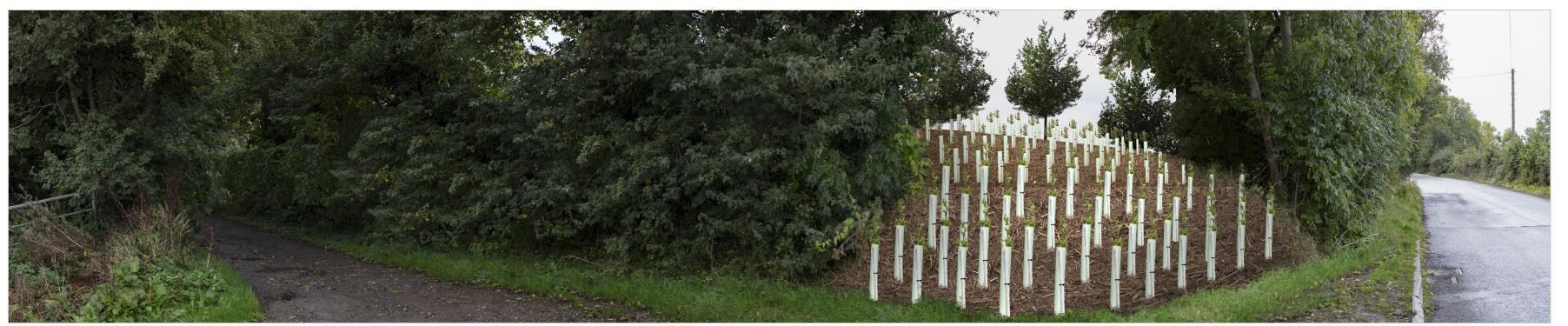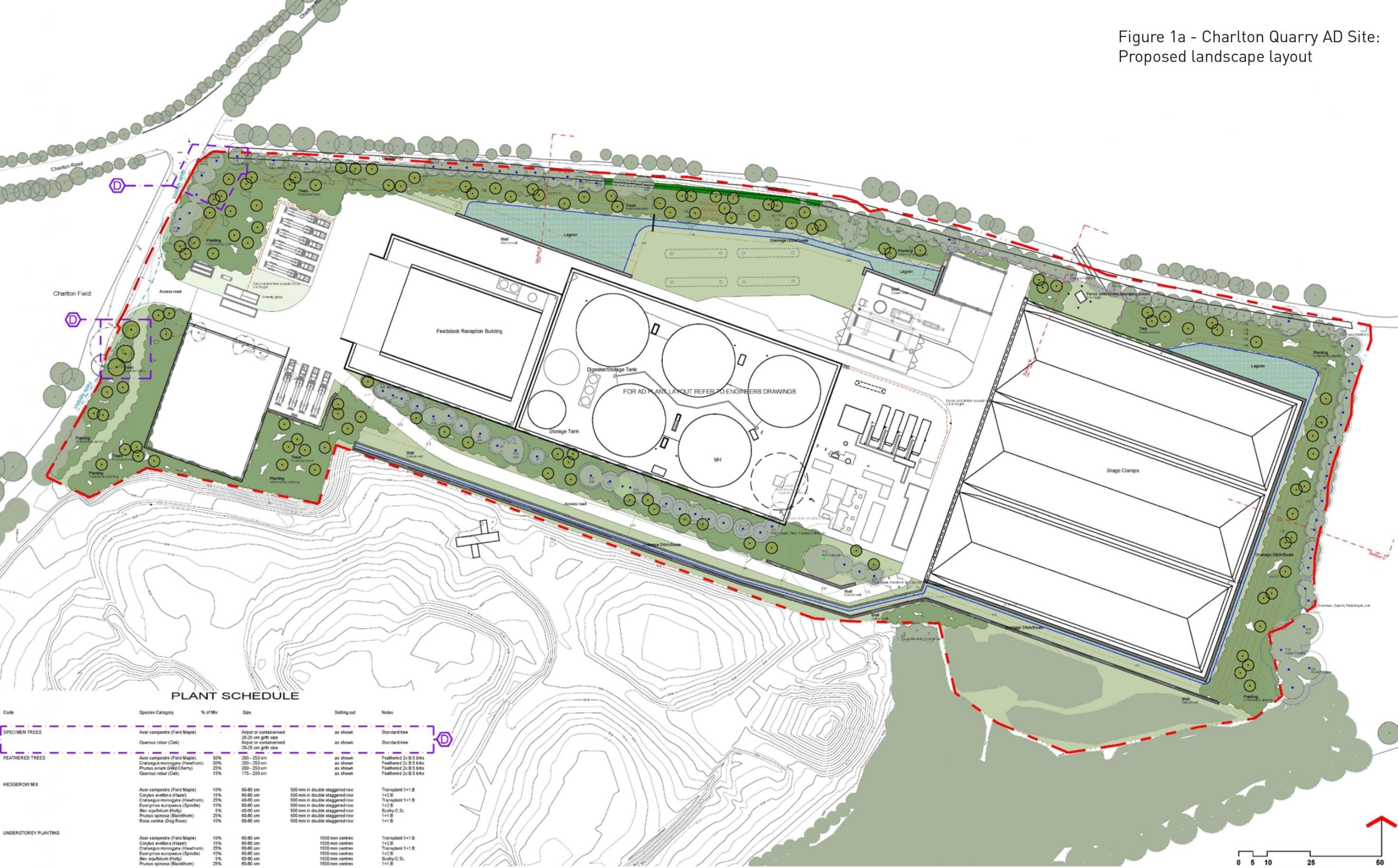 This proposed layout illustrates a revised layout and design to the existing AD Plant A new landscape layout proposed new woodlands planting that covers site, adding some water retention to minimise the impact of water surface damage, and more pathways as the parts of support the site managements. The planting schedule is also set to convinced the clients how the landscape is improving the visual impact of the site. The proposed trees and hedgerows boundaries are composed and aligned to link visually with vegetation pattern of the countryside. It will soften views to building site by restoring the native woodlands and will integrate this brownfield site within the landscape character of the site