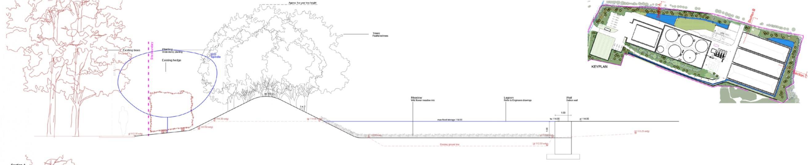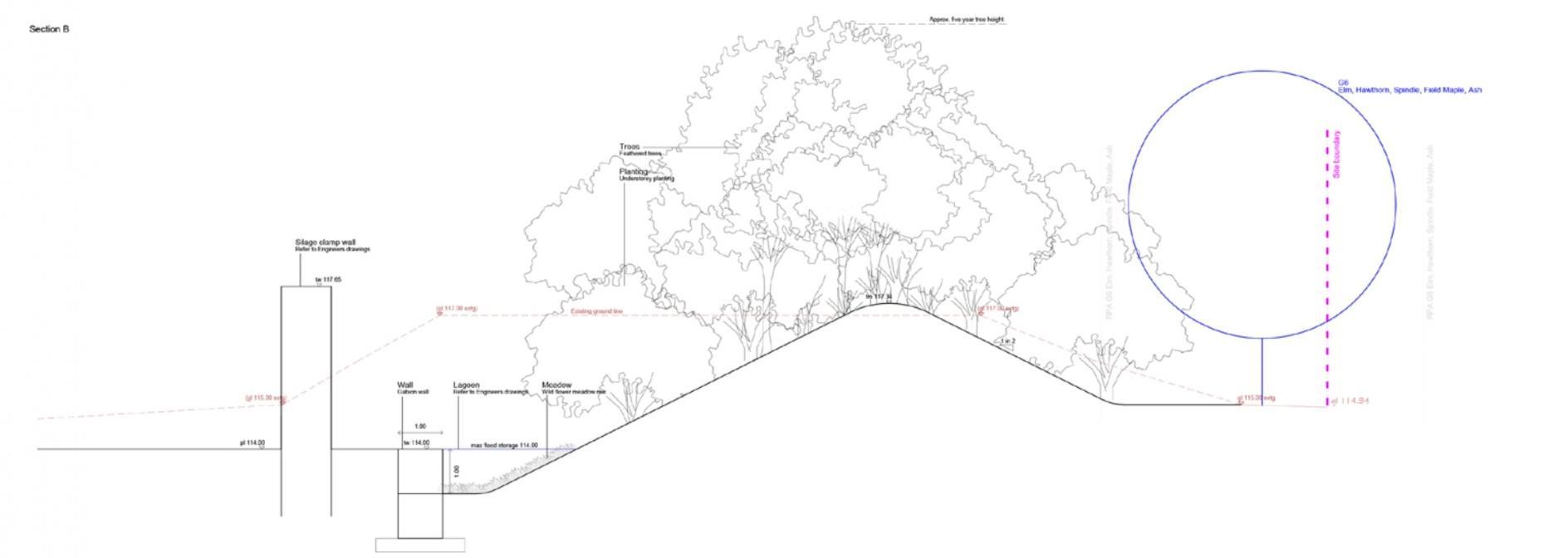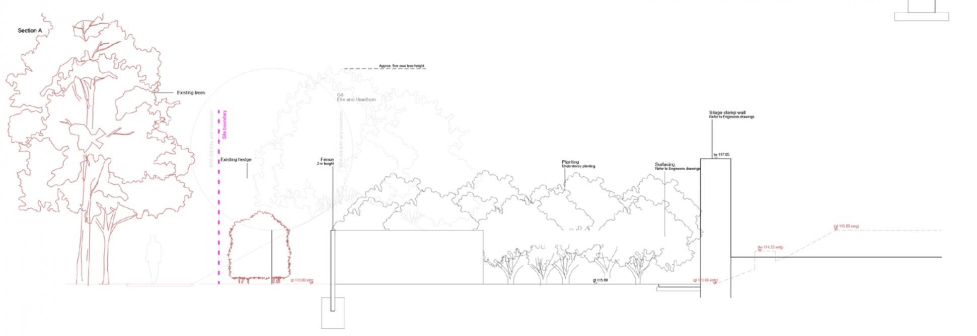 The sections indicates the level of proposed landscape on the site boundary so that the vision of reducing impact of water surface accomplished Series of landforms, woodlands and plantings, and water retentions are proposed in accordance to the new AD Plant layout so a visual impact possibility could be reduced after several years of completion.