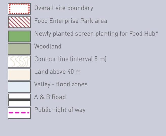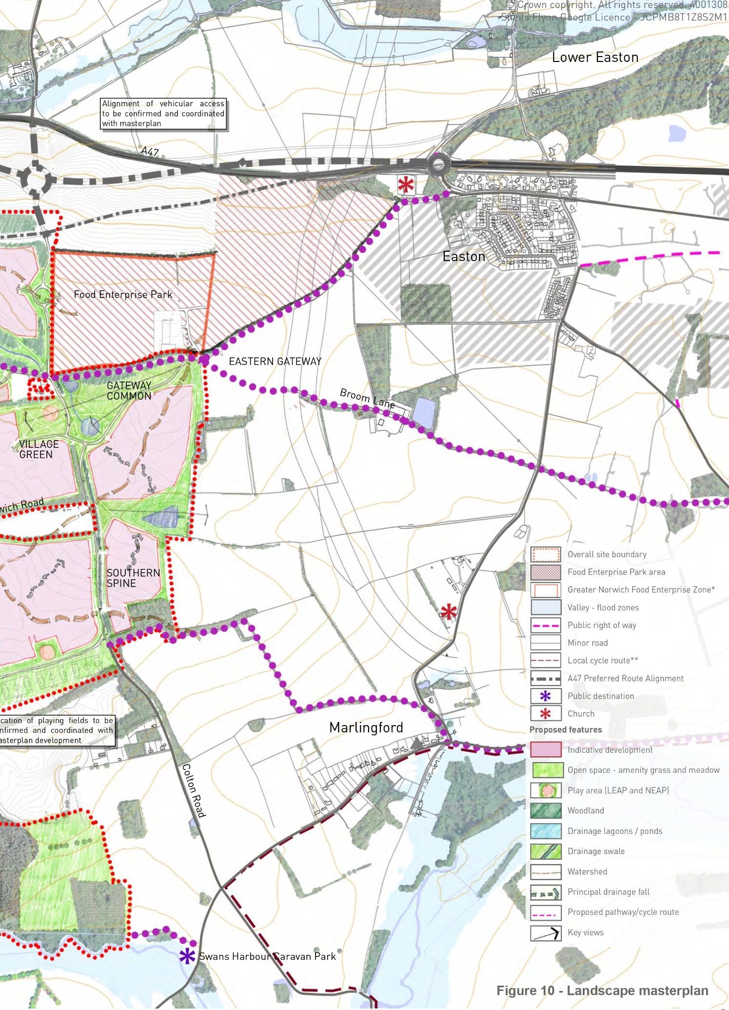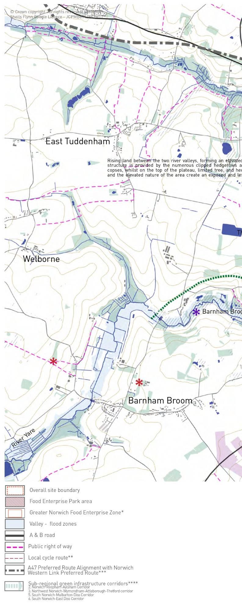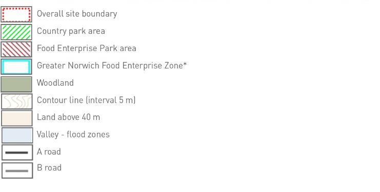 The main site laid at the western of The Greater Norwich It can be accessed from A47 roadway The site boundary shows includes future Food Enterprise Park, area zoned as the first phase of the development – centre of the site boundary, and country park area on the lower valley alongside the floodplain of the River Yare.