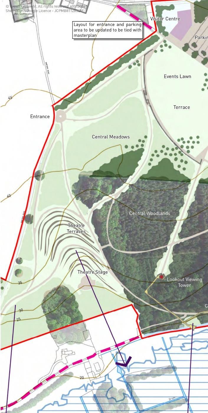 • Proposing some features at the entrance area (e g visitor centre, terrace and lawns, play area, and retention ponds