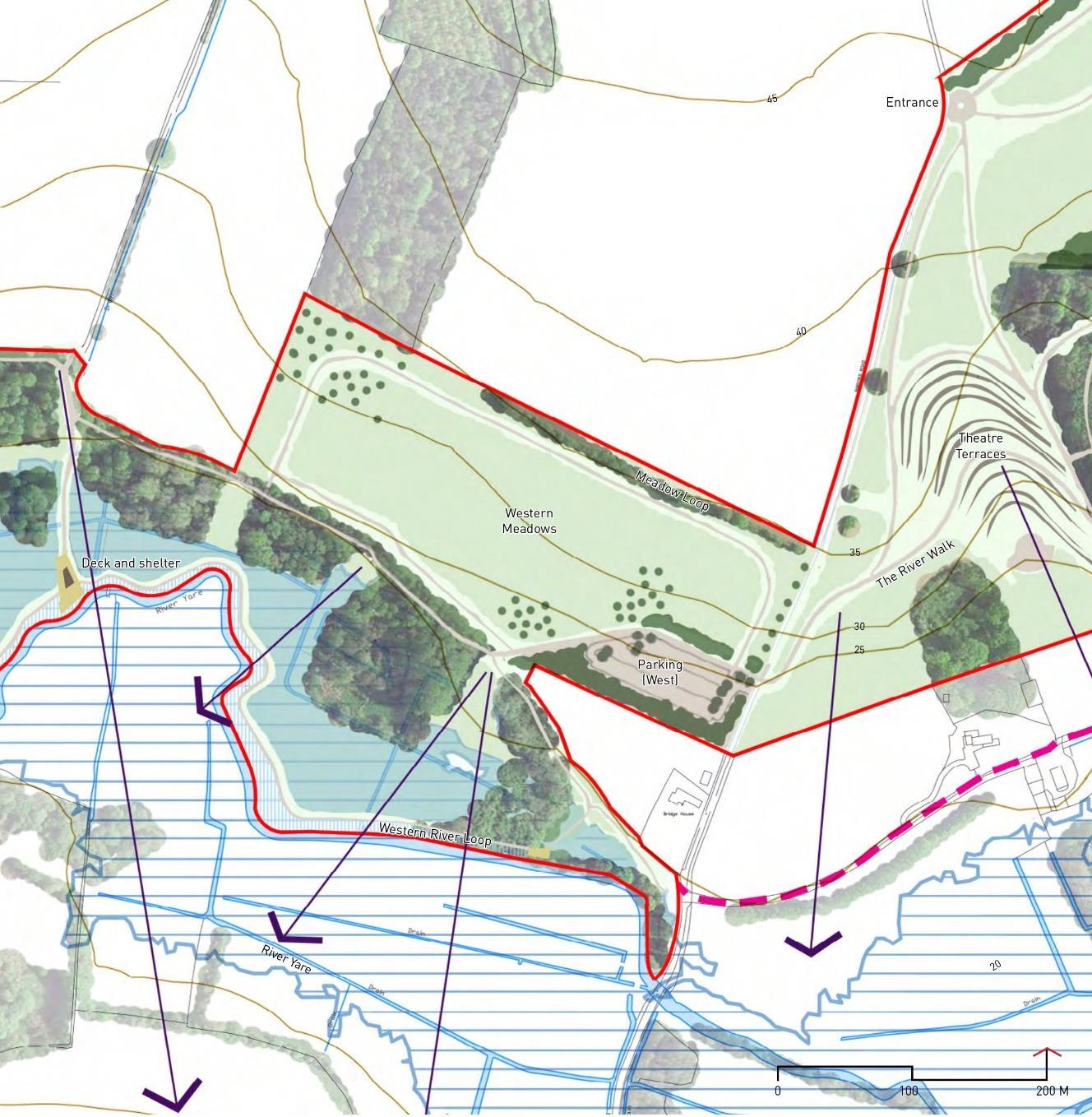 At the western part of Colton Park the proposal is related to retaining existing ecological features by adding supporting landscape elements (e.g. pathways, park entrance, deck & shelter, parking, and River Loop)