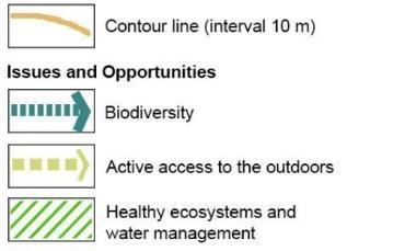 The diagram indicates a strategy which identify the opportunity for the new landscape infrastructure to enhance the quality of existing green infrastructure corridors and linking the site development. It shows potential to integrate recreation, ecology, and water management The landscape character is also taken into account to suggest how vary is the landscape of the site over the site that stretched from north to south