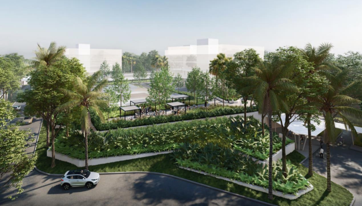 Avenue trees extend across the boulevard, creating a forecourt to The R7A shop-houses. Next to the roundabout, groups of palms and elegant signage walls frame views towards the frontage