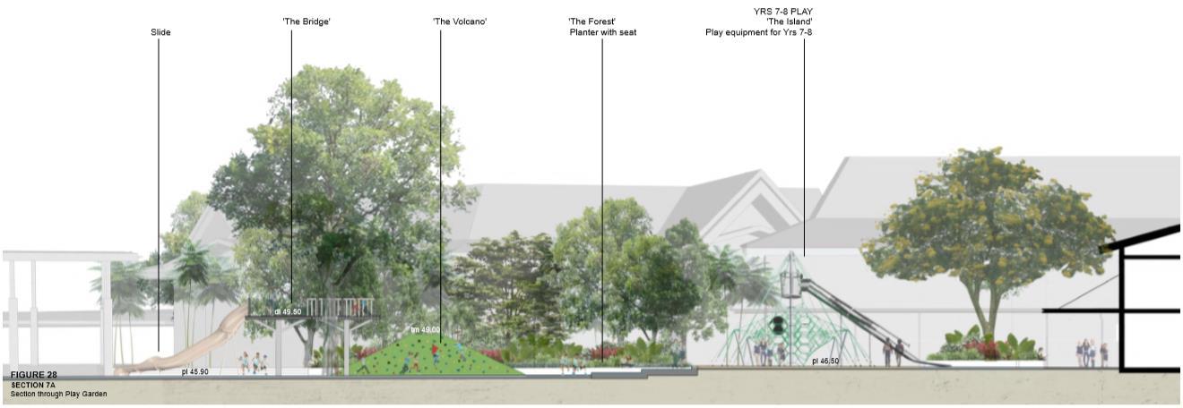 The play garden connects the Secondary and Upper Primary Schools and is designed to offer exciting, interesting, and safe play opportunities for Years 7-8, 5-6, and 3-4 The space extends from the existing basketball court to the play areas in the current Primary layout