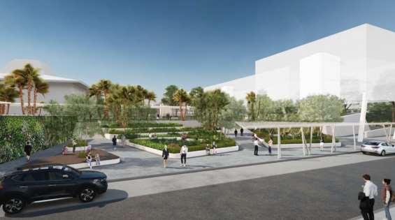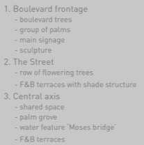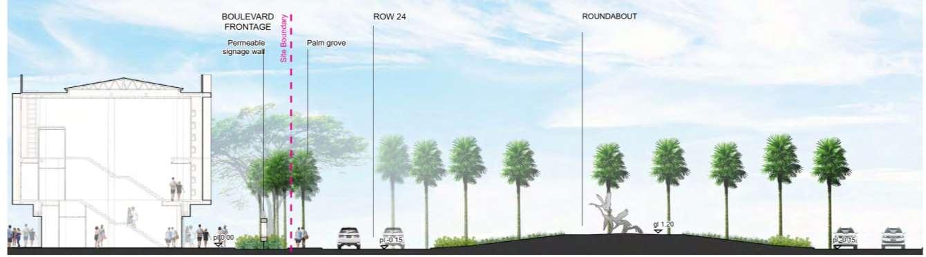 Avenue trees extend across the boulevard, creating a forecourt to The R7A shop-houses. Next to the roundabout, groups of palms and elegant signage walls frame views towards the frontage
