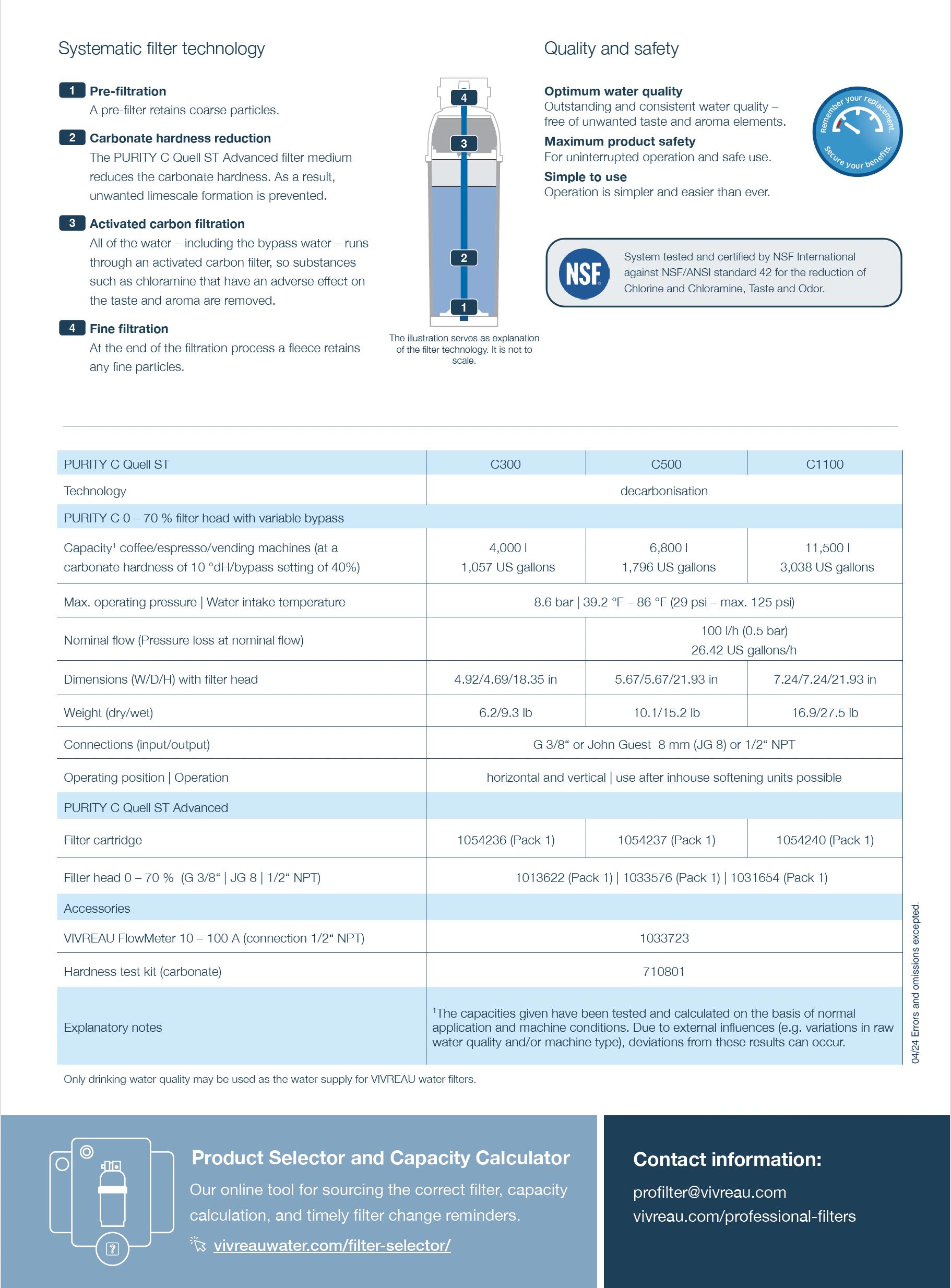 With its activated carbon block, the PURITY C1000 AC reliably retains residues in the water that can negatively affect the taste, aroma or appearance of the end product. With the particularly fine pores of the carbon block, even the smallest particles (down to 0.5 m) are prevented.